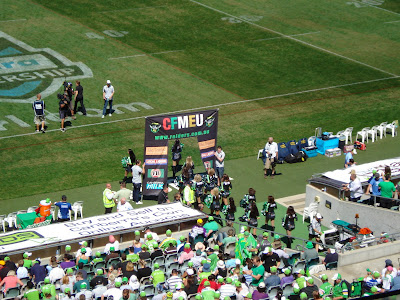 Anyway, the below pictures are from the NRL game we went to see with our British friends, Karen and Ant (of Thanksgiving and Hobart New Year's fame). I give you- the Canberra Raiders! They're team color is bright, neon green, and while they are historically an awful team, they finished strong last year, just sneaking into the play-offs, so there are high hopes for this year. To give you an idea of how ill thought of the Raiders are, every year analysts make two picks at the start of the season- who will win the Premiership (championship), and who will win the Wooden Spoon, the worst team in the league. The Raiders are always a safe pick to make.